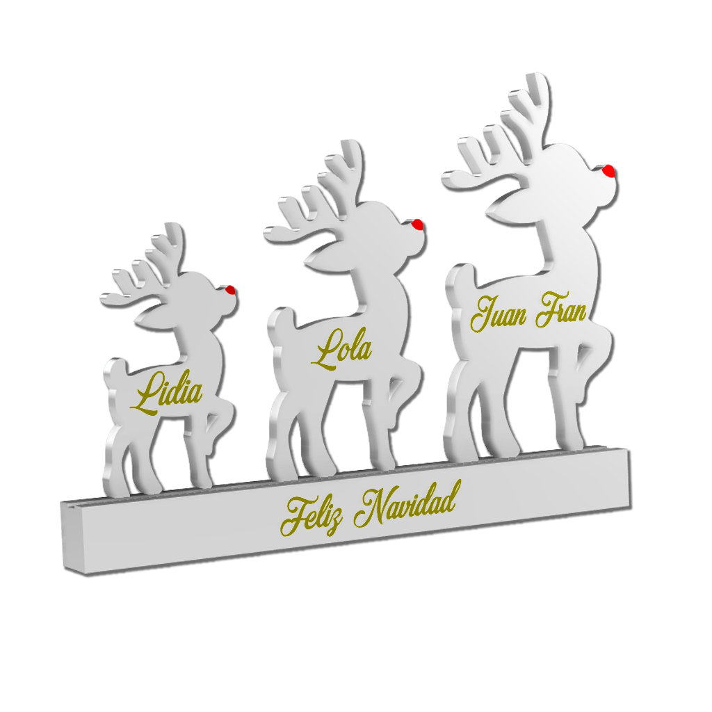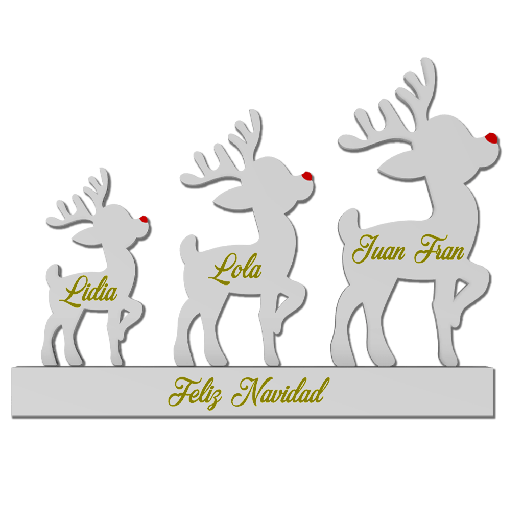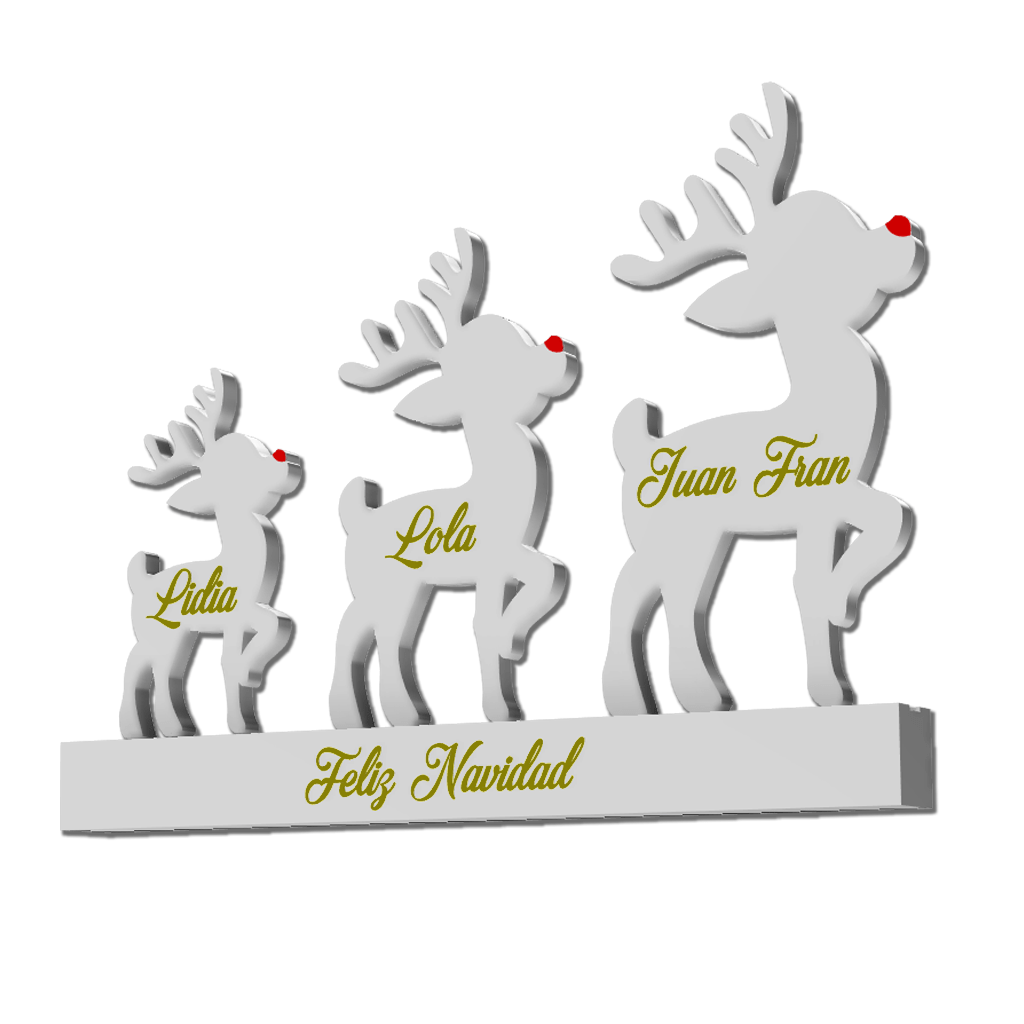 Adorno navideño para decorar o para regalar que representa a los miembros de la familia. A mayor número de miembros (renos) serán más pequeños ya que el ancho total es invariable.